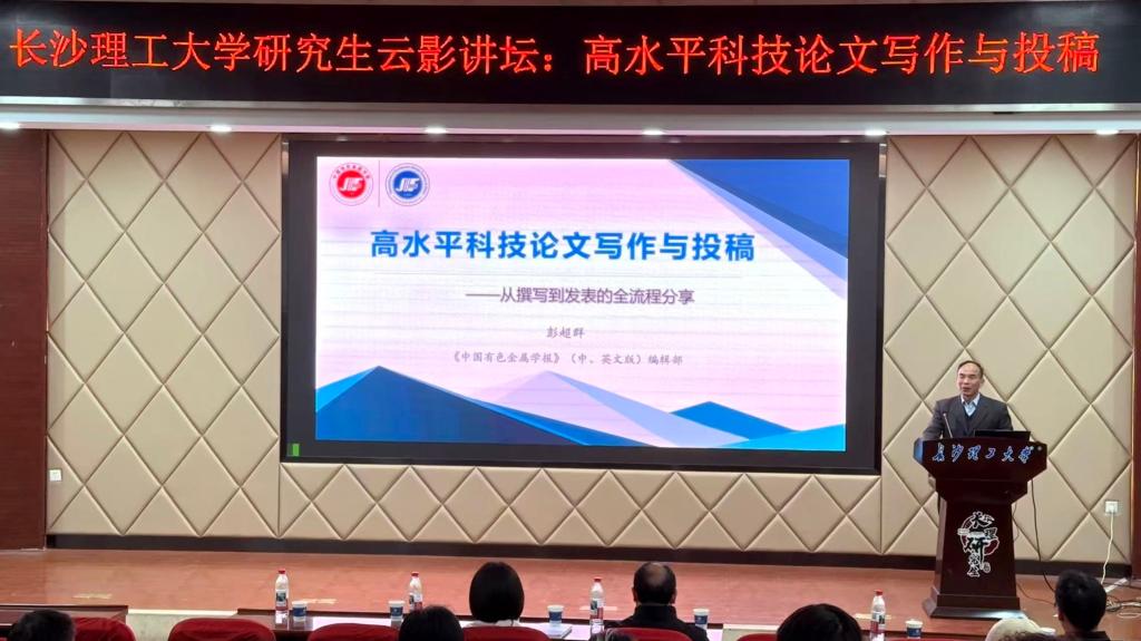 12月4日下午14:00,材料科学与工程学院承办的研究生“云影讲坛”在云塘校区文科楼A200举行。本次论坛特邀中南大学教授、博士生导师,《中国有色金属学报》(中、英文版)执行副主编彭超群博士担任主讲人,以“高水平科技论文写作与投稿”为主题,为在场师生带来了一场内容详实、针对性强的学术指导。讲座由材料学院副院长谢炜主持,学院党委副书记邵巧艳、专任教师吴翔、唐晓威等出席。材料学院全体研究生以及全校理工科学院研究生代表积极参与,现场学术氛围浓厚。