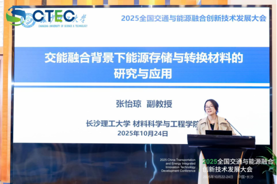 2025年10月24日上午,2025全国交通与能源融合发展创新技术大会主题论坛一“交能融合理论与实践”在长沙举行。论坛邀请政府、学界与产业界代表,聚焦交通与能源深度融合的战略、技术与实践,共谋交能融合发展新路径。我院新能源材料与器件系主任、副教授张怡琼作为学界代表受邀在分论坛作《交能融合背景下能源存储与转换材料的研究与应用》专题报告。