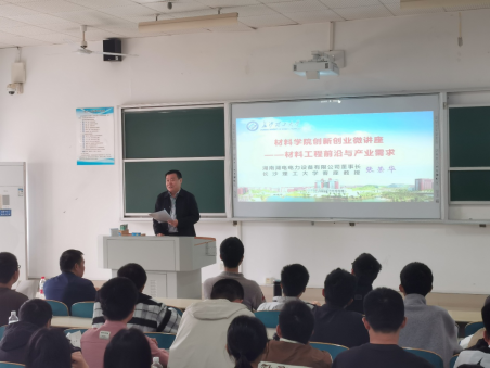 11月12日下午,湖南湖电电力设备有限公司董事长张荣华应邀走进“材料工程前沿与产业需求”课堂,在云综教A-404为材料学院师生带来一场精彩的创新创业微讲座。公司副总工程师石成兴、人力资源部部长谢妮一同到访,无机非金属材料工程专业2025级全体新生现场参与交流。
