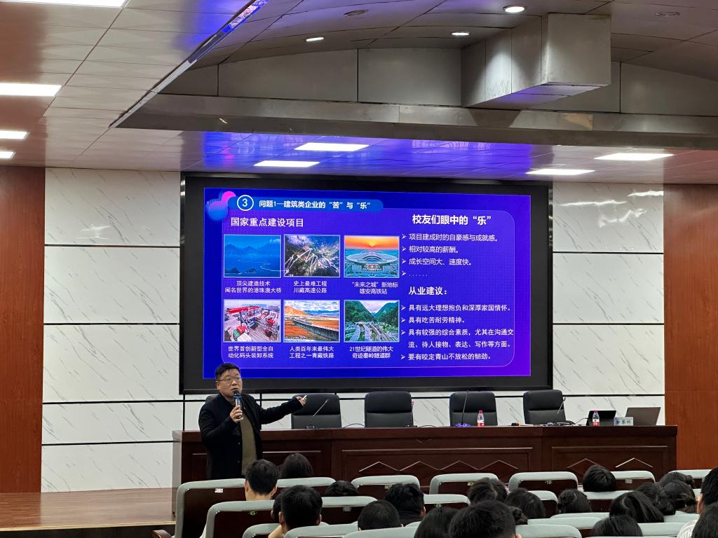 除此之外,他还结合交通土建系的专业属性,跟同学们谈了建筑类企业的“苦”与“乐”,给同学们分享从业建议,并强调:“学什么不重要,重要的是学了什么”,希望同学们抱有咬定青山不放松的韧劲和吃苦耐劳的精神,无论是否从事本专业工作,都应追求多方面发展,打开思维,勇于竞争。
