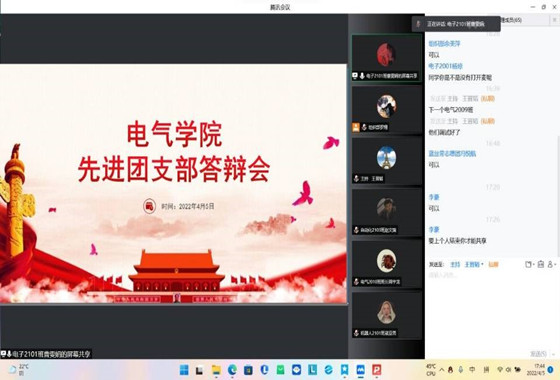 4月5日下午,电气学院2021-2022学年“五四评优”先进团支部答辩会于腾讯会议线上举行。学工办老师田孟萍、杨宸君、范凯、王迪、张一鸣及分团委各部门代表出席,本科生19级、20级和21级各班团支书参加本次答辩会。本次活动由智能电网2102班王晋韬主持。