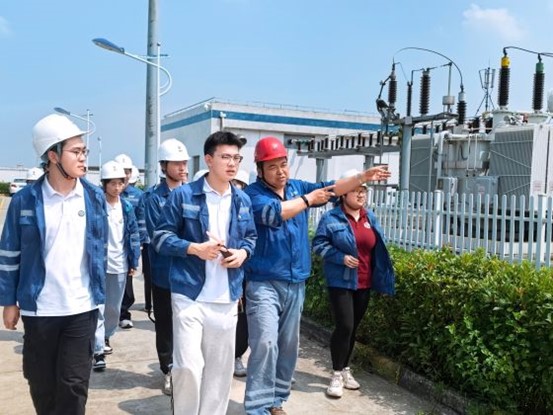 当日下午,实践队前往常熟福山光伏发电有限公司110KV升压站进行实地探访。在技术人员和老师的现场讲解下,队员们近距离观察了升压站核心设备,并通过实时监控操作系统界面,直观了解了电站的日常运行管理、电力汇集与输送流程。这种“眼见为实”的体验极大增强了队员们对大型新能源项目建设和智能运维管理的感性认识与专业认同感。