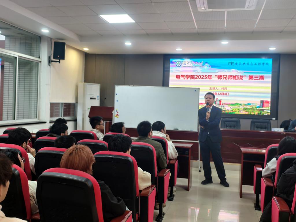 12月4日,电气与信息工程学院成功举办“师兄师姐说”优秀校友成长分享会,特邀2007级校友,现任国网山东超高压公司党委党建部主任、工会副主席付兴返校,与学弟学妹面对面交流。报告厅内座无虚席,现场掌声不断。