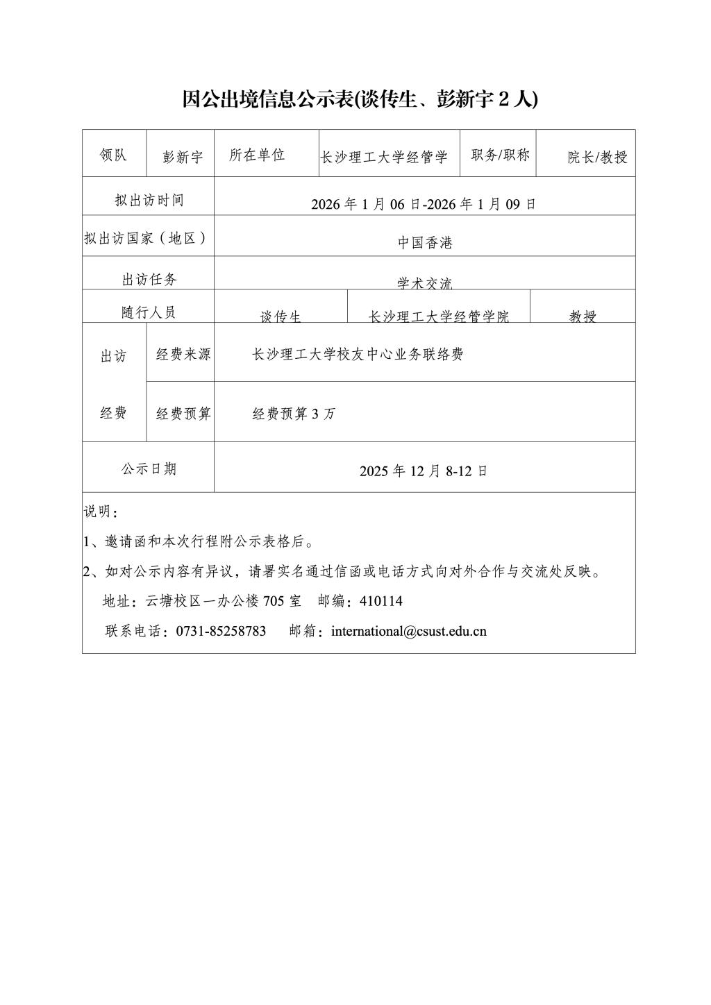 因公出境信息公示表(谈传生、彭新宇2人)