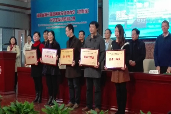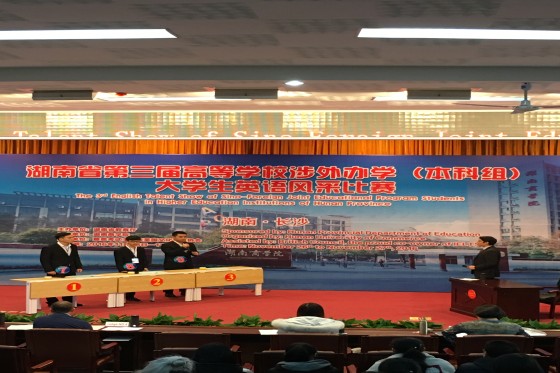 湖南省第三届高等学校涉外办学(本科组)大学生英语风采比赛内容采用小组讨论和才艺展示2个环节,每参赛队的三名选手与外籍主试官就抽取的文章进行讨论,同时参赛选手每人回答必答题一道,另外有抢答题2道,每道题回答时间为3分钟;才艺展示以团队形式结合英语语言的运用上台展示才艺,时间为5-8分钟。小组讨论和才艺展示评分分别占总分的60%和40%,最后根据总分评选出团体奖和个人奖。国际学院3名学生在指导老师的指导下,在小组讨论和才艺展示环节中不畏强手,沉着冷静,尤其是2016级学生高添雄更是表现突出,获得了评委的一致肯定和现场观众的阵阵喝彩,以扎实的英语功底和优秀的语言运用能力获得了个人总分第一名。