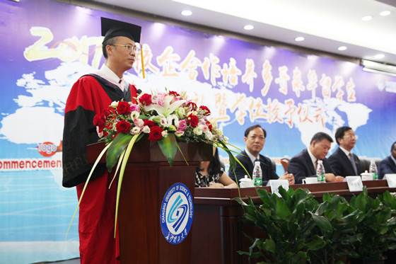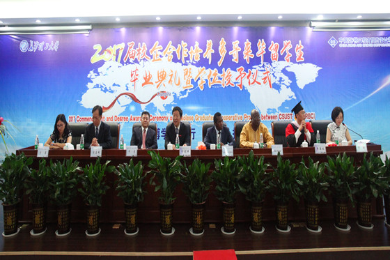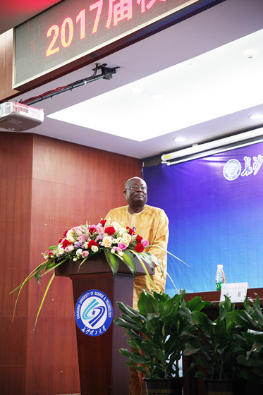6月22日上午,我校2017届校企合作培养多哥来华留学生毕业典礼暨学位授予仪式在云塘校区国际学术交流中心隆重举行。多哥共和国总统府顾问文森特•卡特瓦布亚吉阁下,多哥共和国驻华使馆代办科乔维•贝萨•梅桑干先生,湖南省人民政府外事侨务办公室、湖南省人民对外友好协会专职副会长刘启峰先生,湖南省教育厅国际交流处主任科员刘颖女士,留学生的资助方代表,中国路桥工程有限责任公司党委副书记、纪委书记兼工会主席申展先生,人力资源部副总经理宫海龙先生、市场部副总经理于剑锋先生,我校党委书记付宏渊教授、副校长蒋昌波教授出席典礼。我校有关职能部门、学院领导、在校留学生和部分师生代表和中国路桥相关部门领导共200余人参加典礼。