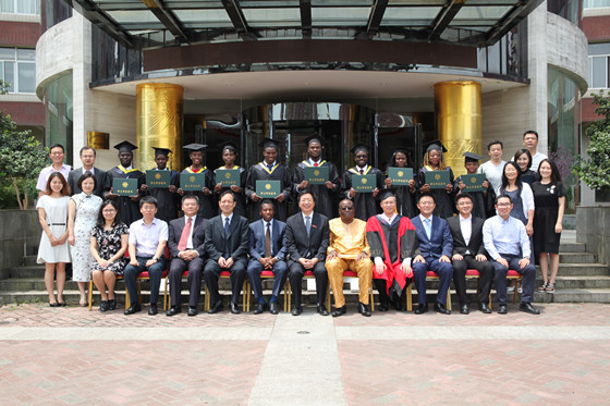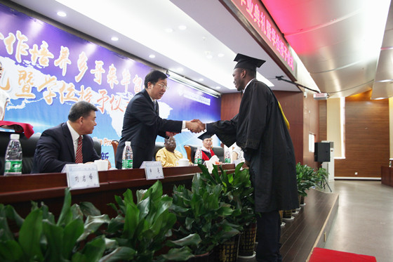 10名身穿学位服的多哥留学生随后依次上台,蒋昌波为每一名毕业生授予学位和颁发学位证书。