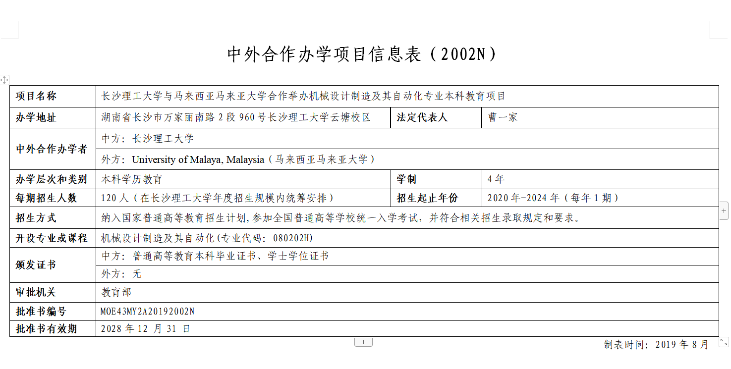 近日,教育部发文《教育部关于批准2019年上半年中外合作办学项目的通知》(教外函〔2019〕55号),共30个项目获得批准,我校与马来亚大学(University of Malaya)合作举办的机械设计制造及其自动化专业本科教育项目位列其中,这是我校继土木工程、电气工程及其自动化专业项目后从教育部获批的第3个中外合作办学项目,是我校本科教育国际化办学上水平、上台阶的又一标志性成果。