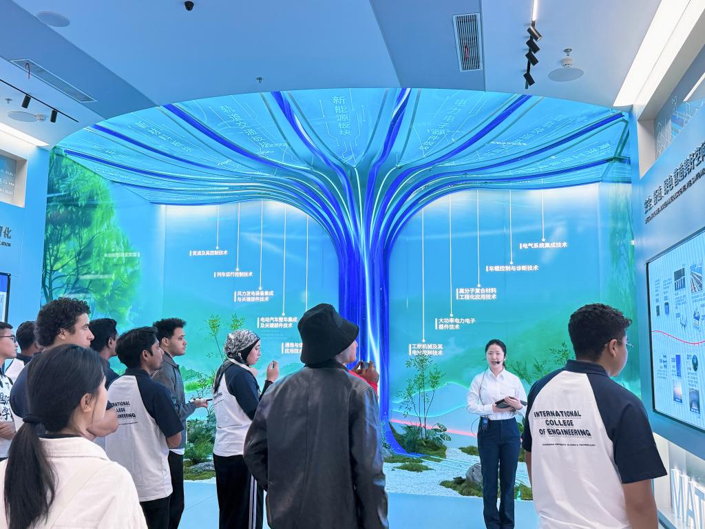 在企业展厅,同学们在中车专业讲解员的引导下,系统了解了中车株机的发展历程、技术创新成果与全球业务布局。从早期电力机车到如今先进的磁浮列车、智慧城轨系统,一系列精密模型与生动影像,清晰展现了中国轨道交通从“跟跑”到“并跑”乃至“领跑”的历史性跨越,使同学们对“中国制造”向“中国智造”的转型有了更加具象的理解。