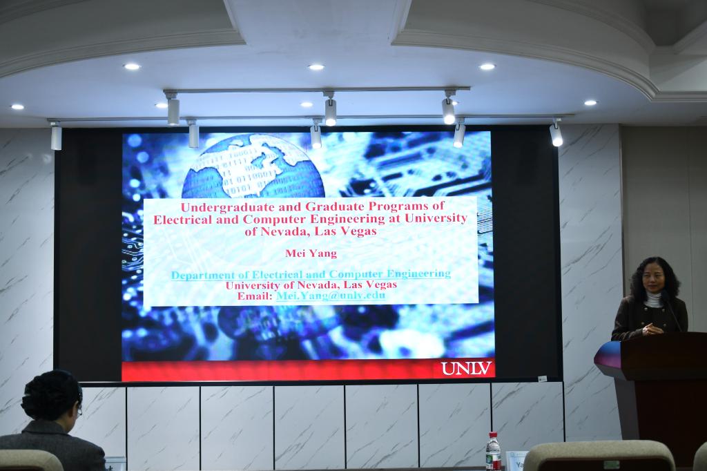 12月30日下午,美国内华达大学拉斯维加斯分校(UNLV)电气工程专业宣介会在云塘校区文科楼D区207报告厅举行。本次宣介会特邀UNLV工程学院电气工程系主任 Mei Yang教授主讲,教务办主任余志老师以及我校中外合作办学项目电气专业50余名学生参加。