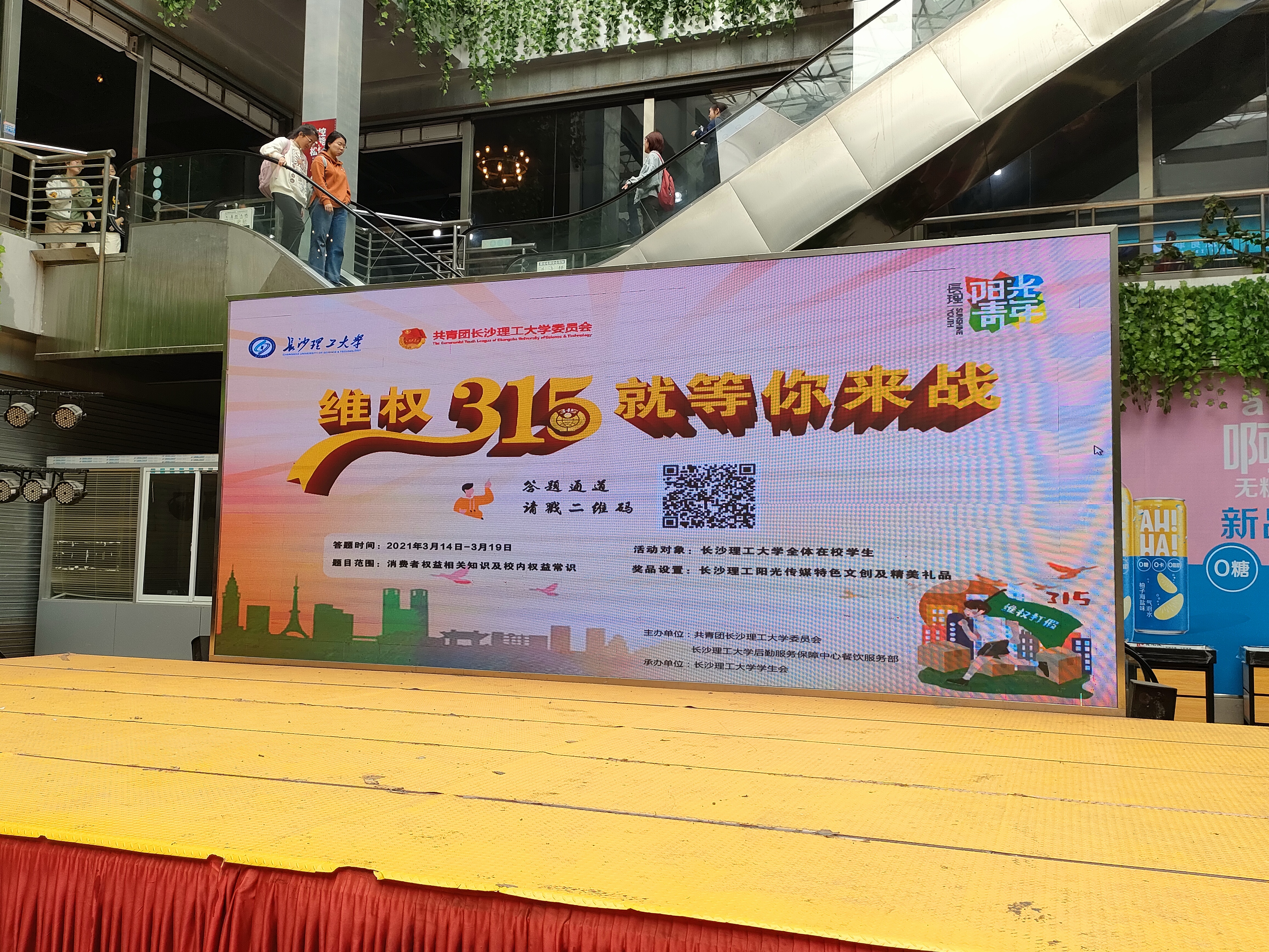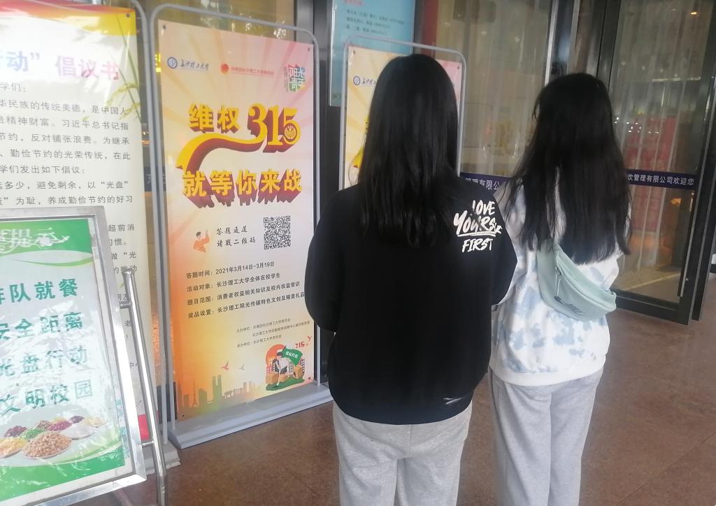 餐饮服务部通过电子显示屏和海报的形式,向同学们介绍维护消费权益的知识,同学们还可扫海报上的二维码进入维权知识竞赛答题通道在线答题。