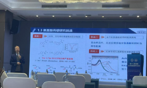 12月14日下午,电力与交通材料保护湖南省重点实验室主任曹忠教授受邀主持了分会场报告会,同期作了题为“媒介驱动氨基酸选择性检测的电化学传感新方法”的特邀主题报告,引起了与会者的广泛关注与热烈讨论。曹教授聚焦于蛋白质的基本结构单元——氨基酸分子选择性检测领域的最新进展,特别是其团队研究发展的基于媒介驱动的电化学传感新方法。该方法提出引入特定的媒介物质,通过改变分子离子或颗粒物之间的化学反应路径,显著提高了化学生物传感器对氨基酸的选择性和灵敏度,为生物体营养健康和心脑血管等疾病的早期诊断和医学精准治疗提供了新的思路和技术手段。