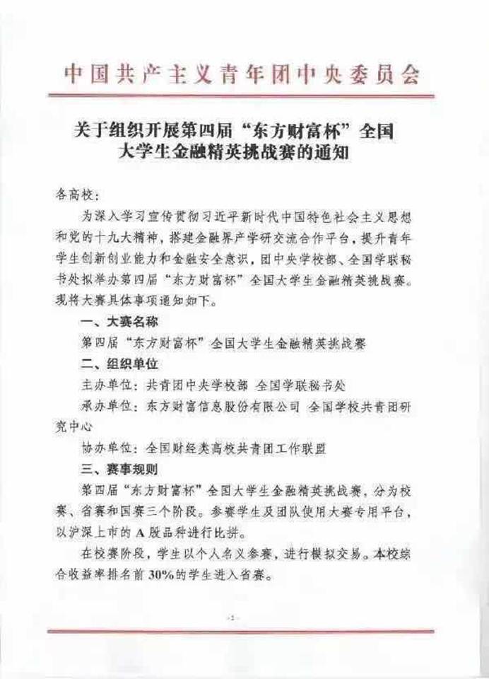 第四届“东方财富杯”全国大学生金融精英挑战赛是由团中央学校部、全国学联秘书处主办、东方财富信息股份有限公司、全国学校共青团研究中心联合承办,全国财经类高校共青团工作联盟协办、Choice数据提供数据支持的一项全国性青年学生创新创业能力比赛。该比赛由参赛者使用大赛专用平台,以竞赛期间A股交易收益率水平作为比赛成绩。比赛分为校赛,省赛和国赛三个阶段,2018年9月10日开始,2018年12月21日结束。我校共有146位同学参加了本次比赛,其中28支队伍晋级省赛,2支队伍晋级国赛。