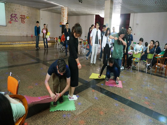 联谊会按入场手环颜色分为六组进行比赛,开场的“我们认识吧”环节让大家迅速的进入了游戏的状态,作为热身的“抢凳子”游戏赢来了下面观众的阵阵掌声。随后的“两人三足车轮战”游戏激发了同学们的热情,舞厅的气氛达到了顶峰。中场休息时间主持人开始现场抽奖送礼品,之后又依次进行了“传递圈子”、“猜歌名”等游戏。最后,伴随着“击鼓传花”抽愿望活动,联谊会进入了尾声。整场活动历经3个多小时。