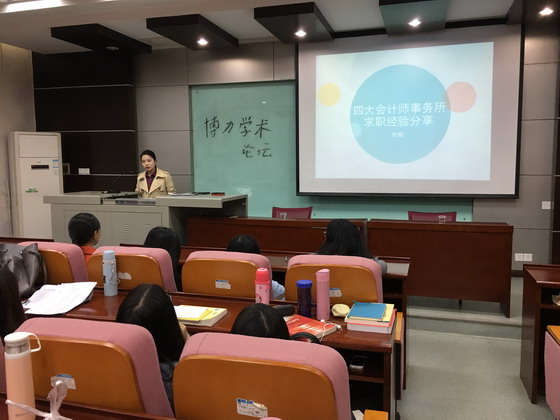 2016年10月27日19:00,第十二届长沙理工大学博力学术论坛经管学院分坛第四场在金盆岭校区7教211成功举行。主讲人是14级硕士研究生张畅同学,主题为“四大会计师事务所求职经验分享”。经管学院2015、2016级研究生参与此次讲座。