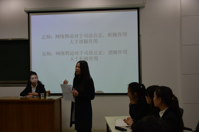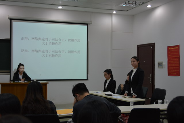 辩论赛论题为“网络舆论对司法公正,积极作用与消极作用孰强孰弱”,担当正方的是经济班代表队,担任反方的是会计1班代表队。继正方慷慨激昂、反方简单幽默的自我介绍后,比赛进入开篇立论环节。正方一辩胡凌霜表示网络舆论能抑制司法腐败现象的发生,有利于提高司法效率,使司法过程透明化,公正化。反方则以社会案例为例,进行层层剖析,强调网络舆论的主观性与随意性为司法公正带来阻碍。在随后的攻辩环节,双方旁征博引,妙语连珠,针锋相对,互不相让,现场气氛迅速升温,达到白热化阶段。