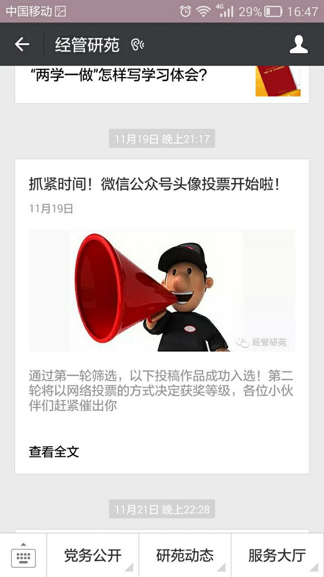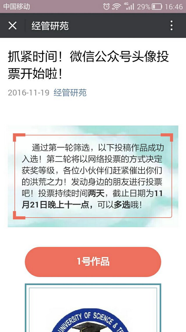为增强经管学院研究生公众号宣传力度,培养学生创新精神,经管学院于11月举办“经管研苑”微信公众号头像征集大赛,比赛持续一个月。“经管研苑”是经济与管理学院研究生自己的微信公众号,由原来党建公众号转型为党团共用微信公众号,不仅进行党务宣传工作,还定时推送学院通知和各类活动等重要新闻动态。本次比赛的主题为突出“经管学院”与“研究生”的结合,增强学生对经管学院的主人翁意识。