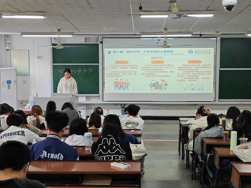 班会第一部分是政策宣讲解读,各班班长带领大家一起学习《湖南省大力支持大学生创业若干政策措施》、湖南省教育厅《支持大学生创业若干措施》、《国产a视频免费观看不卡支持大学生创新创业若干措施》等文件,让同学们了解湖南省相关就业政策红利。第二部分为第二届“金种子杯”大学生创业大赛动员,通过解读大赛方案、宣传奖励政策,动员符合条件的同学积极参赛。最后,班委还介绍了我校大学生创新创业园(孵化基地)支持政策等内容。