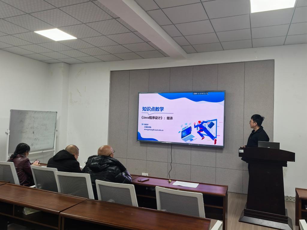 2026年1月20日上午10点,计算机学院在金盆岭校区9教211举办了2026年青年教师教学竞赛院级选拔赛。学院李平教授、史长琼老师和肖红光老师担任评委。各系推荐的张经宇、陈嘉欣、钟海、胡斌和肖淇5位教师参加比赛,五位教师依次登台,在规定的15分钟展示时间内,围绕各自专业课程进行了教学片段演示。