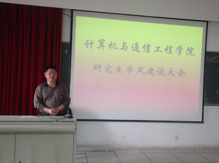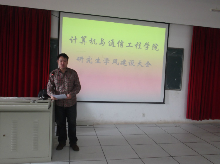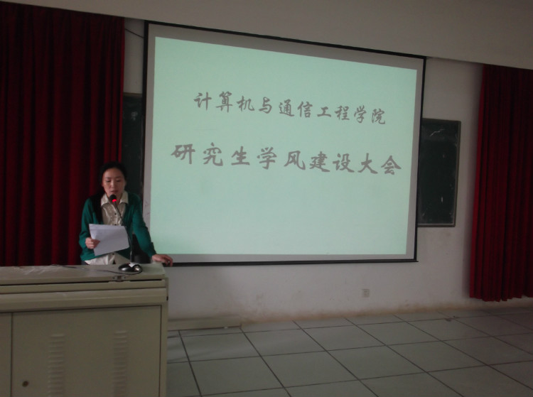 5月4日下午,计算机与通信工程学院在理科楼B311召开研究生学风建设大会。2012年是我校学风建设年,计通学院借此召开本次研究生学风建设大会。院长李峰,院党委副书记方碧波、副院长徐蔚鸿,研究生导师史长琼以及计通学院全体研究生出席了大会,由徐蔚鸿副院长主持。