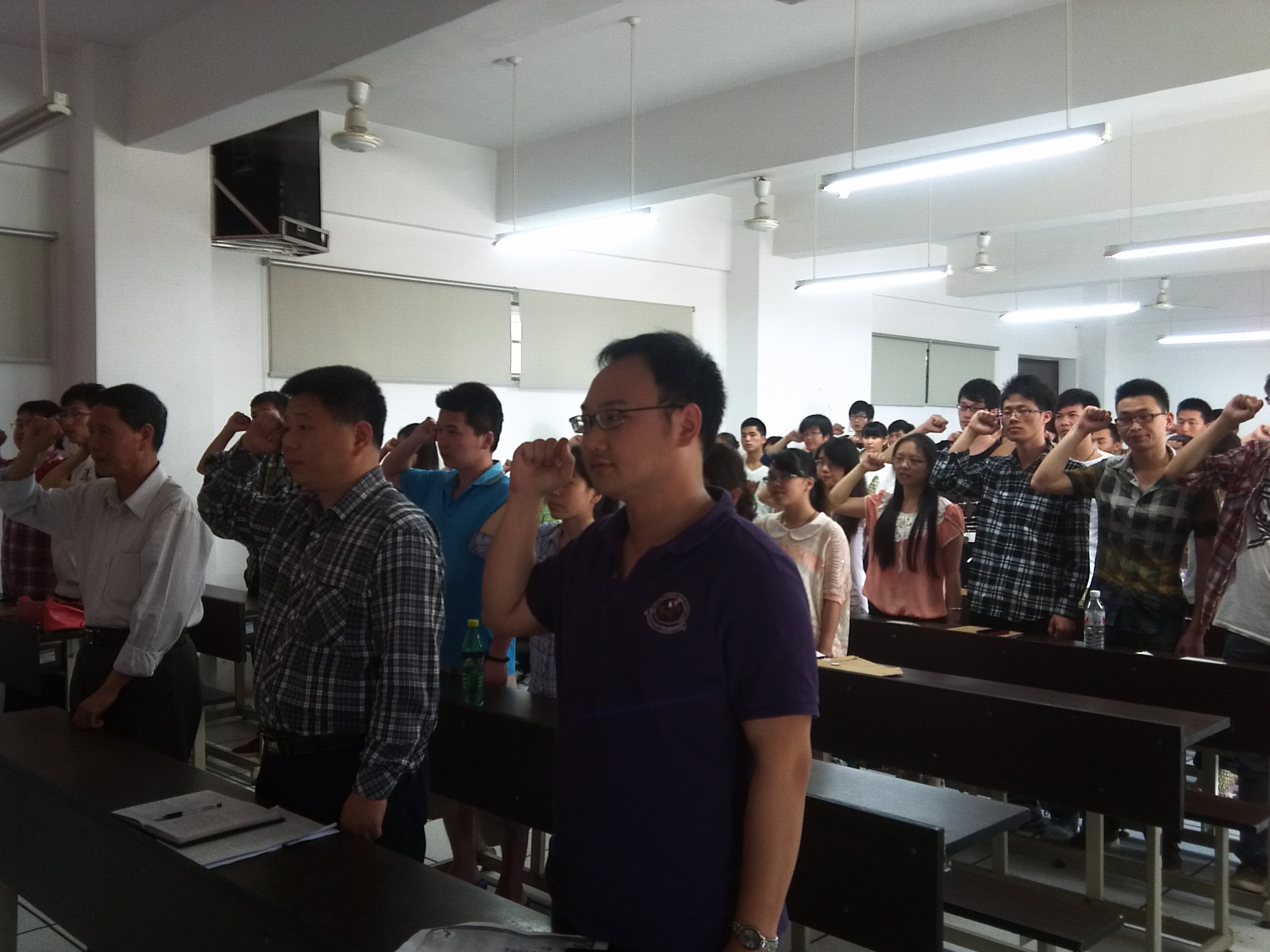 大会在庄严的国歌中拉开帷幕。各学生党支部书记先后上台总结了本学期各支部的党建工作。本学期新发展党员代表陈国华同志发言,表明了入党决心;本学期预备党员转正代表李全同志讲话,表明了党员承诺。随后,全体党员面对党徽进行了庄严的入党宣誓。关工委雷理成老师对参加本次仪式所有成员提出殷切希望:以认真的态度对待党,以坚定的信念捍卫党,以良好的作风塑造党。