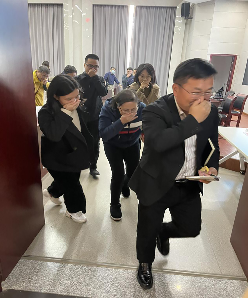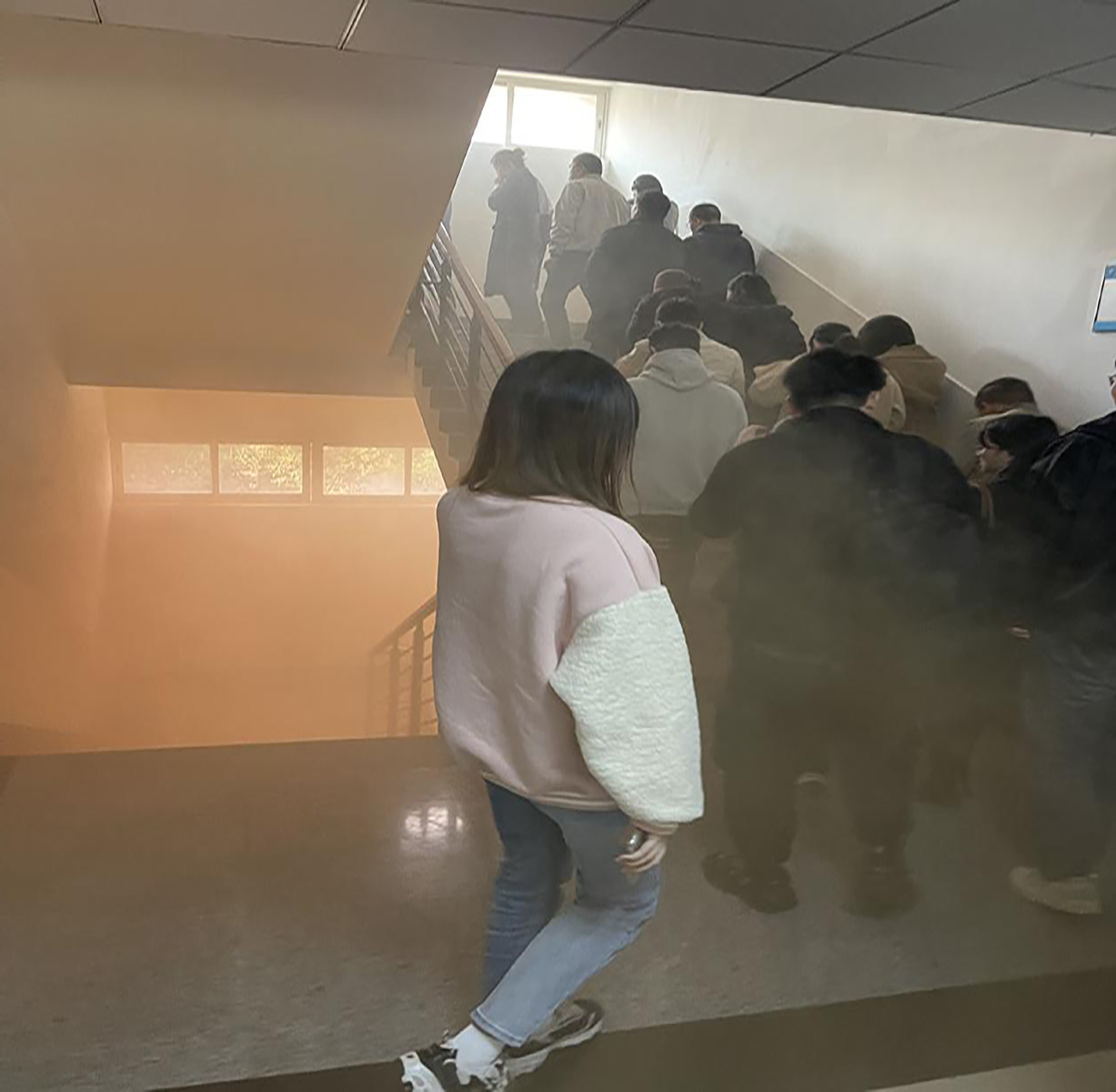下午3:00,工科二号楼浓烟滚滚,模拟疏散演练正式开始,综合办公室主任张纲意识到火灾发生,快速启动消防安全应急预案,与其他领导一起带领全院教职工迅速逃离现场。