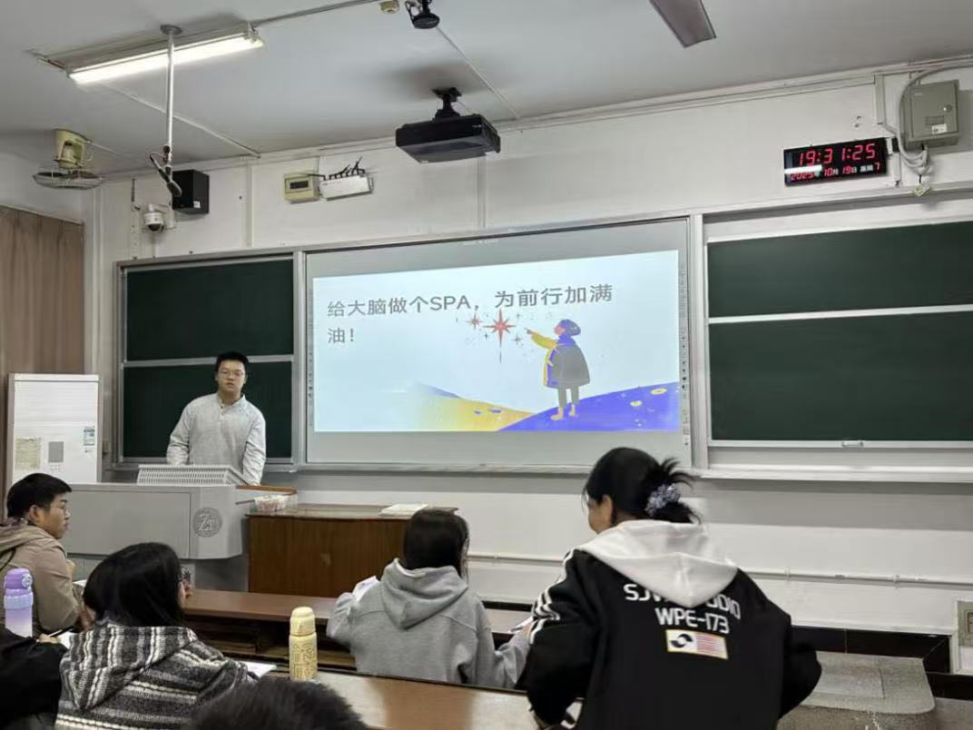 为帮助本科生疏解学业与生活压力,筑牢心理健康防线,10月12日,交通学院面向2024级本科生班级开展“轻心释压”主题健心活动,以“给大脑做个SPA,为前行加满油”为核心主题,为同学们搭建起专业且趣味的心理舒缓平台。