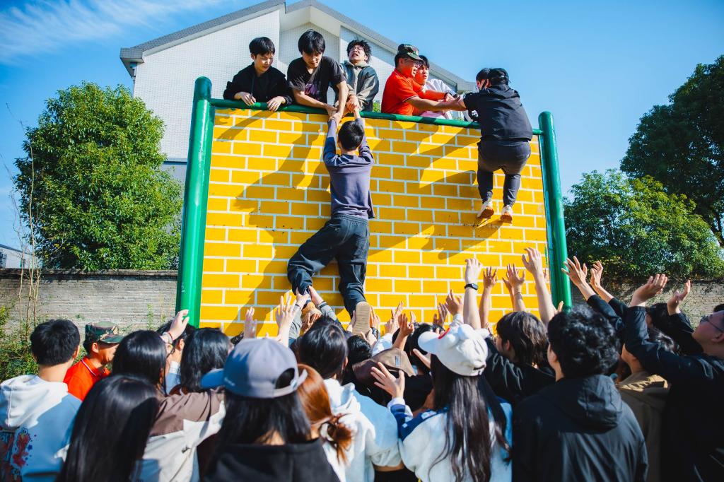 最激动人心的时刻,当属胜利墙挑战环节。一面高达4.2米的光滑墙体如同一座难以跨越的高山,横亘在大家眼前,看似不可征服。然而,在团队的共同智慧与不懈努力下,大家迅速制定出周全的策略。有人毫不犹豫地甘当底座,用自己坚实的肩膀,为队友们搭建起通往成功的坚实阶梯;有人在攀爬过程中毫不犹豫地伸出援手,紧紧拉住同伴,助力他们向上攀登;有人在墙顶稳稳地拉住队友,确保每一个人的安全。在整个挑战过程中,团队成员之间相互信任、相互支持,凭借着顽强的毅力和团结协作的精神,一次次尝试、一次次突破,最终成功翻越了胜利墙。那一刻,欢呼声、掌声如雷鸣般此起彼伏,每个人的脸上都洋溢着自豪与喜悦,大家深刻体会到团结的力量是无穷无尽的,只要心往一处想、劲往一处使,就没有克服不了的困难。
