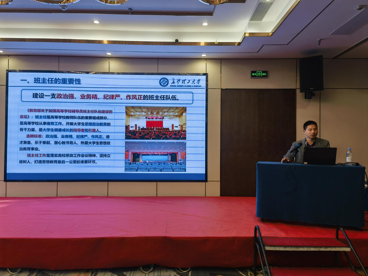 上午10:00,专题培训在素质拓展基地会议厅拉开帷幕。数学与统计学院党委副书记、副院长郑忠辉以《坚持立德树人,培育时代新人》为题,结合习近平总书记关于高校思想政治工作的重要论述,分别从“班主任的重要性”、“班主任工作职责”、“班主任工作重点”、“如何做好班主任工作”四个方面系统阐释了班主任队伍建设的核心要义。他强调,班主任要以“四有好老师”为标杆,当好学生“锤炼品格、学习知识、创新思维、奉献祖国”的引路人,并从“班情熟知、思想教育、班风学风建设、学业引领、生涯规划、心理健康教育”六大职责出发,提出“精心谋划、精细管理、精诚付出、精准施策”的工作方法论。培训中,郑忠辉指出班主任需守好“班会、活动、课堂”三大阵地,重点关注学生家庭状况、心理状态、学习适应及人际关系四类问题,并善用班团干部、下班党员、辅导员、家长及学校职能机构五方支持力,他以“入学教育五个一”、“主题教育七大模块”、“安全教育九大领域”等实操案例,为班主任提供可复制的工作模板,现场反响热烈。