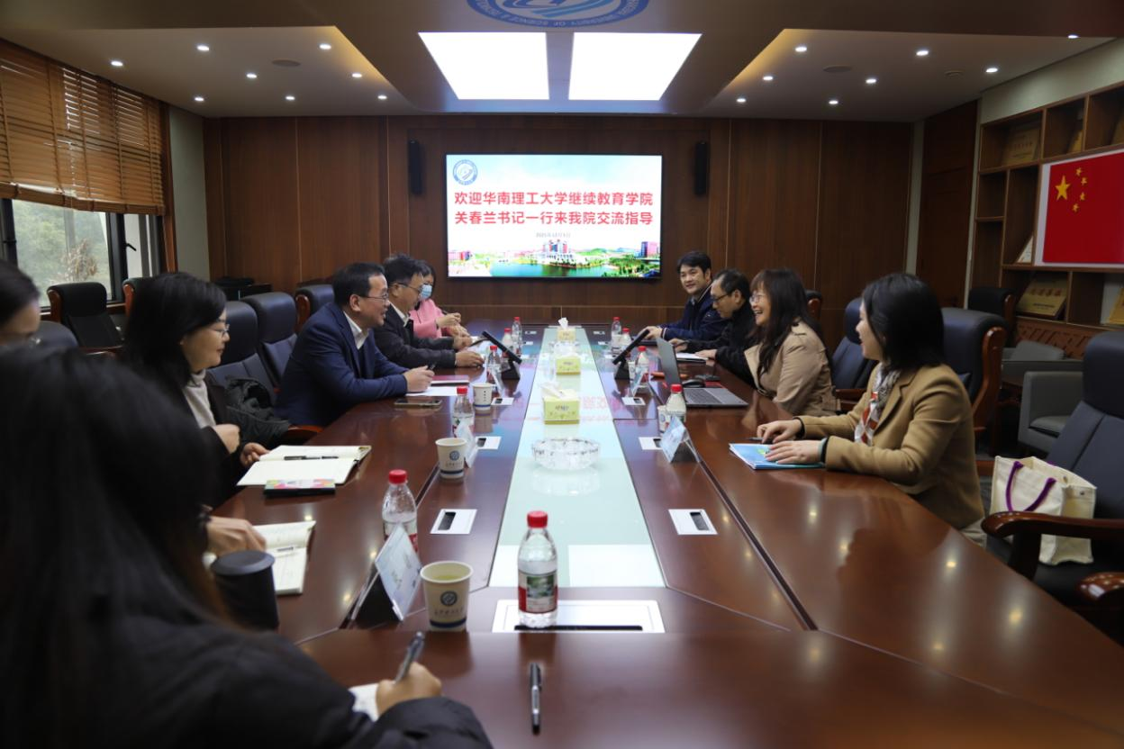 2025年12月5日上午,华南理工大学继续教育学院党委书记关春兰一行到访我院进行调研交流。我院院长邹兴平、党委书记刘思强、副院长郑咏梅以及党政办相关负责人在学院四楼会议室出席座谈会。