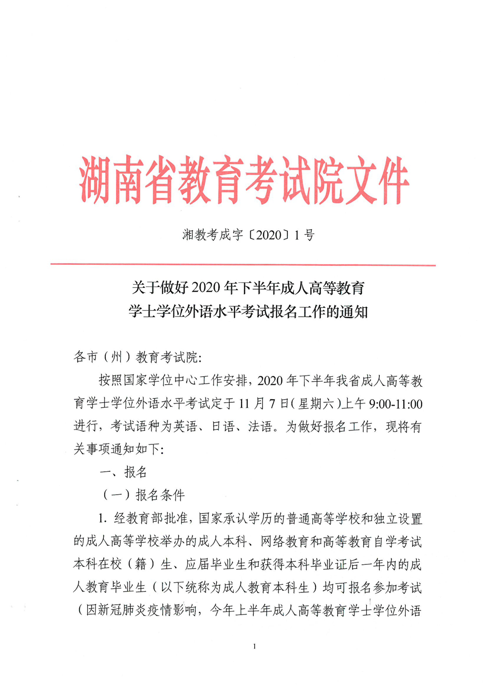 关于我省2020年下半年成人高等教育学士学位外语水平考试报名工作的通知湘教考成字[2020] 1号