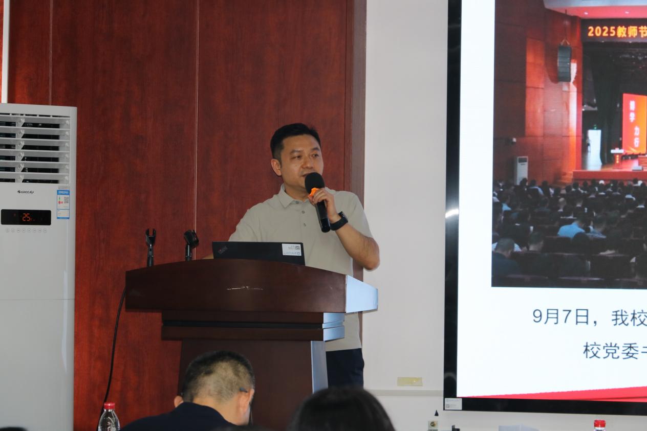 最后,学院党委书记熊鹰传达了学校2025年教师节庆祝表彰大会暨党政工作例会(扩大)等会议精神,并以“趁势而上开新局,凝心聚力促发展”为主题分享心得。强调要把握新技术革命,增强专业改革主动性,加强AI与传统学科融合;全面提高人才培养质量,强化基础教学、实践教学与创新创业教育;增强科技创新与社会服务能力,推动成果转化。熊鹰鼓励全院教职员工凝心聚力、真抓实干,以更大作为为学院高质量发展作出更大贡献,并向全体教职工表达最诚挚的教师节问候。