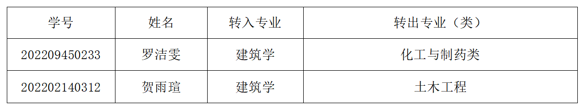 根据学校文件:《关于做好2022级在校本科生转专业(类)工作的通知》文件精神,及《国产a视频免费观看不卡建筑学院2022级本科生转专业工作细则》的要求,经学生个人申请,学院本科生转专业工作领导小组初审,现将学院2022级本科生转专业初审合格名单进行公示,具体名单如下: