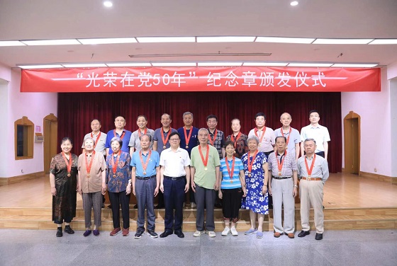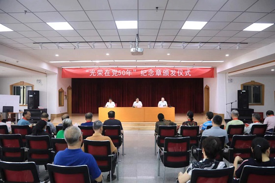 7月5日下午,我校在金盆岭校区五教多功能厅举行“光荣在党50年”纪念章颁发仪式,学校党委副书记刘建民、组织部常务副部长陈曦出席仪式,为24名党龄达到50年的老党员颁发纪念章。仪式由离退休教职工党委书记徐亮主持,部分老同志代表和离退休中心科职以上干部参加。