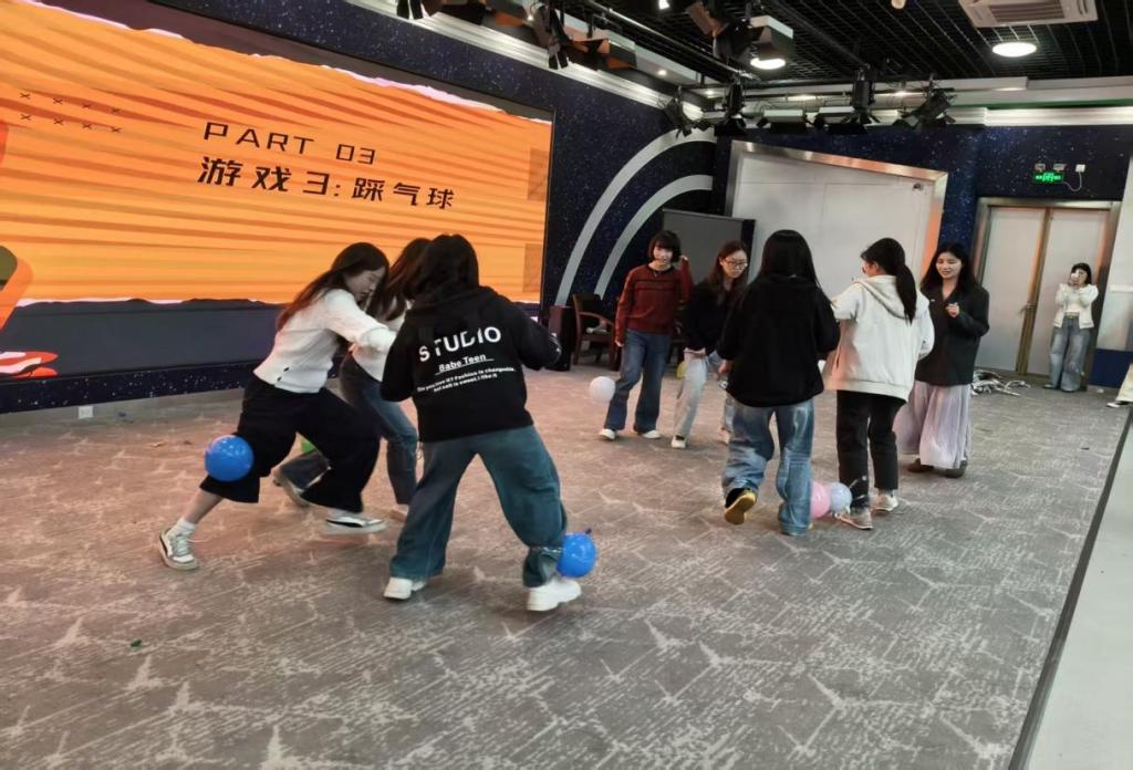 活动伊始,主持人以趣味十足的“糖果抽签”环节拉开序幕。新生们根据糖果颜色迅速分组,为接下来的团队协作游戏奠定了良好基础。随后进行的“报纸大作战”环节,将团队默契推向高潮。各组成员分工协作,在报纸中寻找并拼贴组员姓名进行速度竞赛,并用报纸搭建“高塔”比拼高度。欢声笑语中,同学们不仅拉近了彼此距离,也在合作中增强了团队凝聚力。在全校积极响应世界精神卫生日活动的背景下,本次活动紧扣主题,特别设置了“睡眠知识竞答”环节。现场气氛活跃,同学们反应迅速、沉着应答,在趣味竞赛中既拓展了睡眠健康知识,又进一步提升了心理健康意识。最后的“踩气球”游戏将现场氛围推向最高潮,同学们在保护自己气球的同时灵活出击,清脆的爆裂声与阵阵笑声交织,展现出新时代青年学子的朝气与活力。
