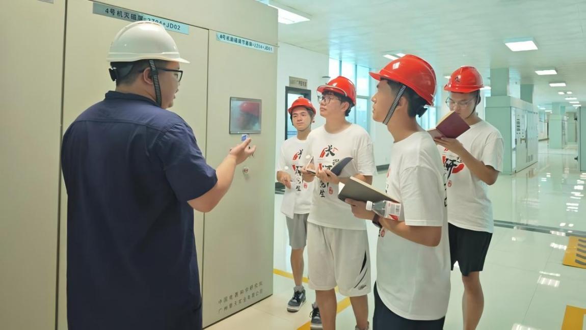 抵达电站后,工作人员带领实践团依次参观了中控室、水轮发电机房、升压站等核心区域,详细讲解了各设备的运行原理和操作规范。在发电厂房内,队员们得以近距离观察水轮发电机组,直观理解“水能—机械能—电能”的转化全过程。据介绍,大源渡水电站共配备5台发电机组,其中4台为单机容量3万千瓦的灯泡贯流式水轮发电机组,1台为1万千瓦的国产自研机组—这台机组的稳定运行,表明我国水轮发电机组制造技术已逐步成熟,具备效率高,运行稳定等显著优势。