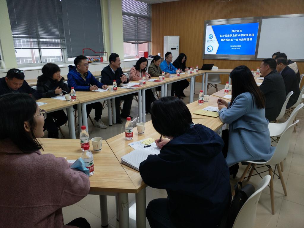 杜荣华对长沙民政学院医学院黄岩松院长一行的到来表示欢迎,并介绍参会人员。随后,向兄弟院校作了《以高质量党建引领学院高质量发展》专题报告,详细阐述了学院获批湖南省党建工作标杆院系的创建经验及学院党建方面开展的特色工作;同时,介绍了学院“三三四”人才培养模式改革方案,匠心文化、匠心学堂建设、课程思政工作等方面。会上,调研双方就党建工作、党建工作与业务工作深度融合、“三全育人”工作、党支部“五化”建设、学生工作等方面进行了交流和讨论。