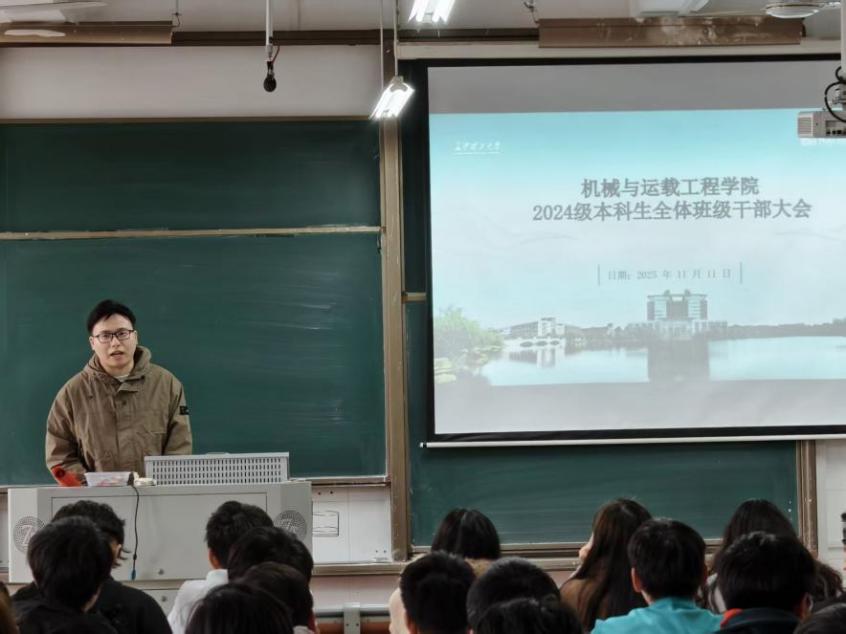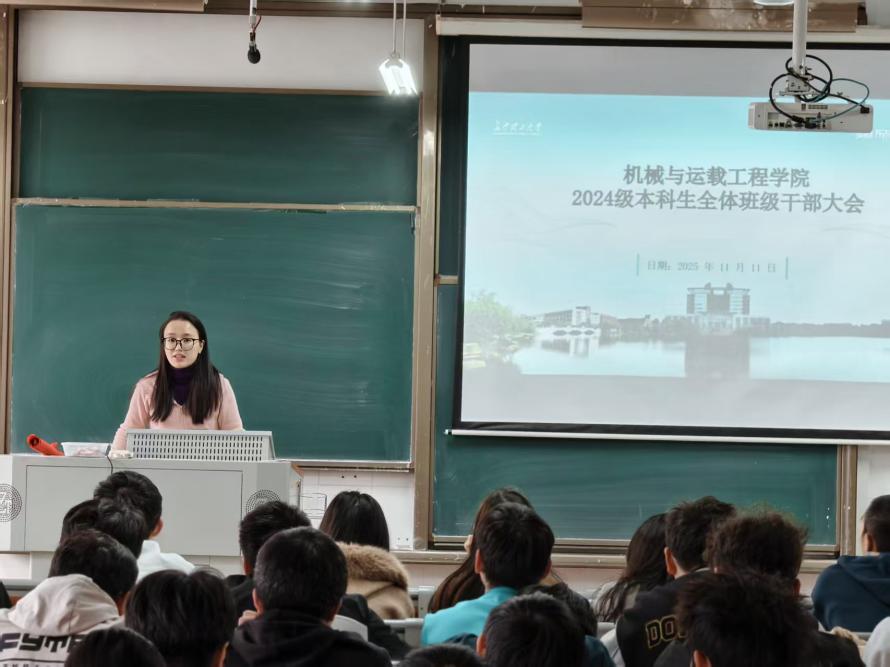 为进一步加强学生干部队伍建设,明确新学期工作方向,凝聚班级管理合力,2025年11月11日,机械与运载工程学院在工科1号楼隆重召开2024级本科生全体班级干部大会。辅导员周媛老师和助理辅导员熊江龙老师及2024级各班班长、团支书、学习委员等核心学生干部参加会议,会议由周媛老师主持。