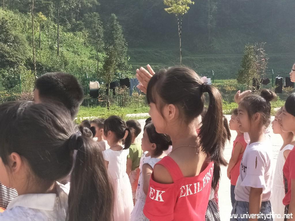 随着音响放出旋律轻快有力的运动进行曲,孩子们在操场有序地集合、排队,支教队队长苏庆颐宣布升旗仪式开始,音响中播放着国歌伴奏,体育老师金程和美术老师武勇刚担任国旗手。在这庄严的仪式中,同学们唱着国歌,行着注目礼,望着国旗徐徐上升。