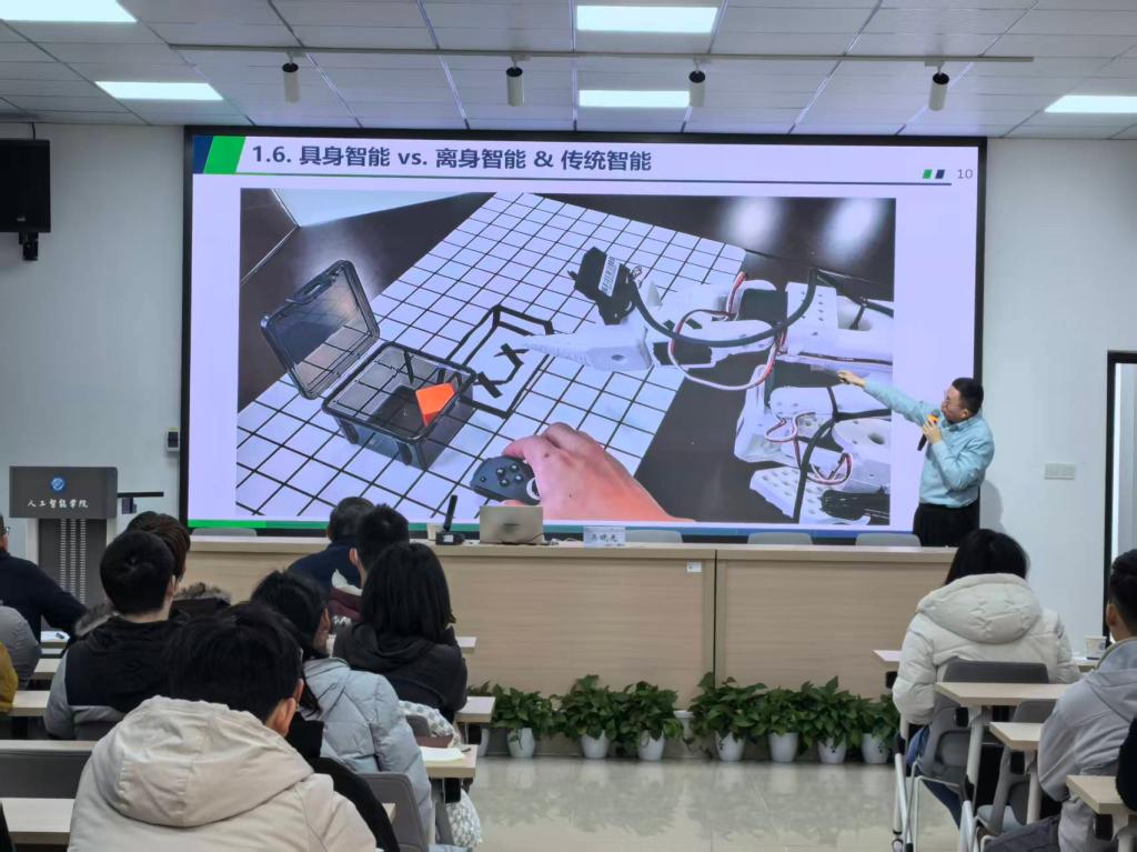 马晓光教授从具身智能的行业发展趋势切入,阐述了从传统智能、离身智能到具身智能的技术演变脉络。聚焦智能机器人、视觉语言导航、低空系统等研究方向,结合自身前沿科研成果与产业实践案例,深入解读了具身智能的技术内核、当前市场格局与高校科研生态,展望了该领域的发展全景与未来机遇。本次学术报告有效拓宽了师生的学术视野,学院将继续深化人工智能的跨学科研究,积极推动产学研用深度融合,致力于培养适应未来发展的复合型智能科技人才,为相关产业的高质量发展贡献力量。