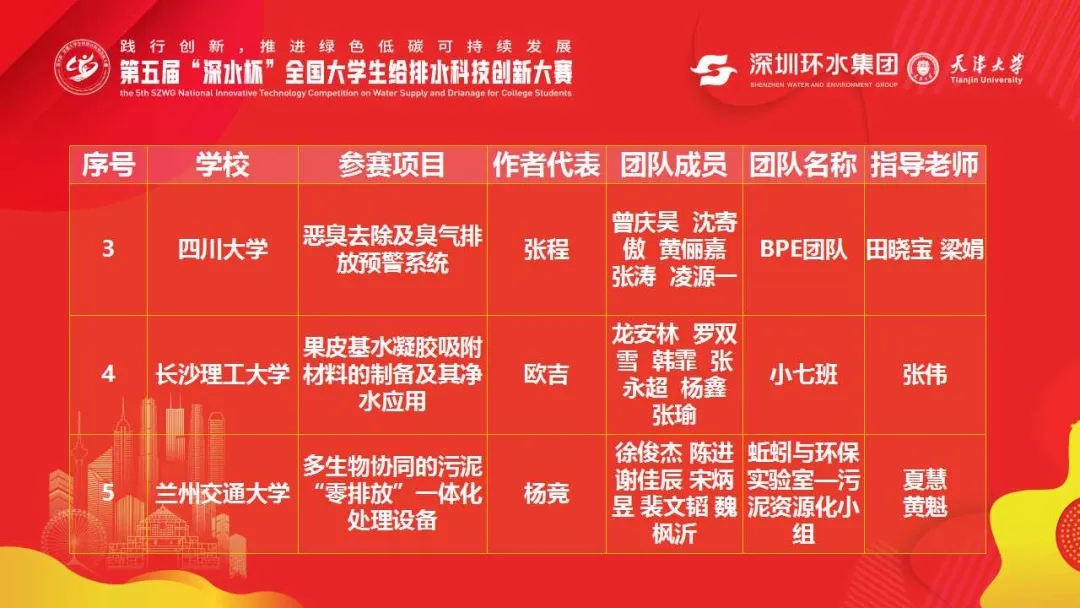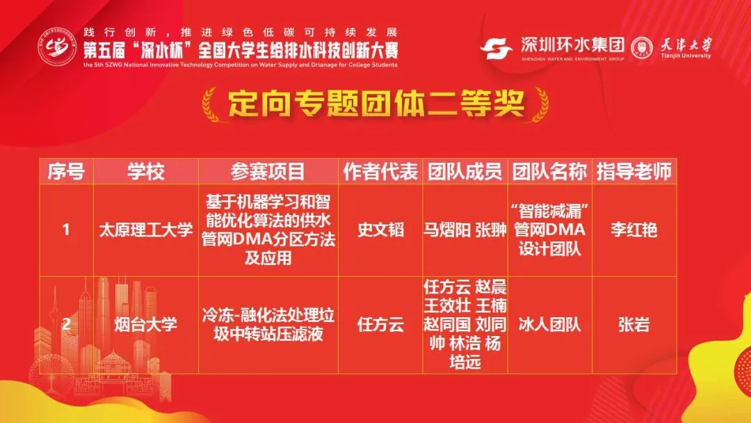 5月13-14日,第五届“深水杯”全国大学生给排水科技创新大赛在天津大学圆满举行,本次比赛由全国大学生给排水科技创新大赛组委会、中国城镇供水排水协会科学技术委员会主办,深圳市水务(集团)有限公司和天津大学承办。来自武汉大学、大连理工大学、华中科技大学、河海大学、四川大学等81所高校的175支队伍参加了比赛。我校选送的两支参赛队伍分别获定项专题竞赛团体二等奖和创意大赛团体优胜奖。