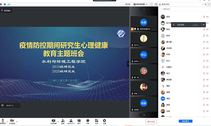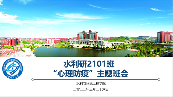 为深入贯彻落实学校关于打赢疫情防控阻击战工作要求和部署,积极引导学生学习心理健康知识,以良好心态打好防疫攻坚战,2022年3月26日至28日,水利与环境工程学院研究生各班级在线上开展了“心理防疫”主题班会。会议由研究生辅导员杜丘主讲,全体研究生参与。