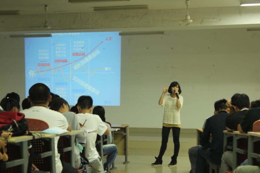 叶老师以一个趣味心理小自查开场,立马吸引了所有新生的注意力,现场气氛热烈活泼。随后,叶老师为大家厘清了高校心理健康教育工作的概念和内容,指出心理健康的工作对象是全体学生而非个别存在心理障碍的学生;学院心理健康工作的目的主要在于主动的辅导和预防而非治疗。她以丰富的案例表明,大学生入学伊始容易出现“光环褪色导致的失落心态”、“理想和现实的反差而引发的消极心态”、“暂时的目标确实导致的迷惘心态”等现象,并和大家共同分享、讨论了大学生活所带来的生活环境、学习要求、人际关系、自我认识和评价等四方面的改变,以及应对上述改变的方法和技巧。