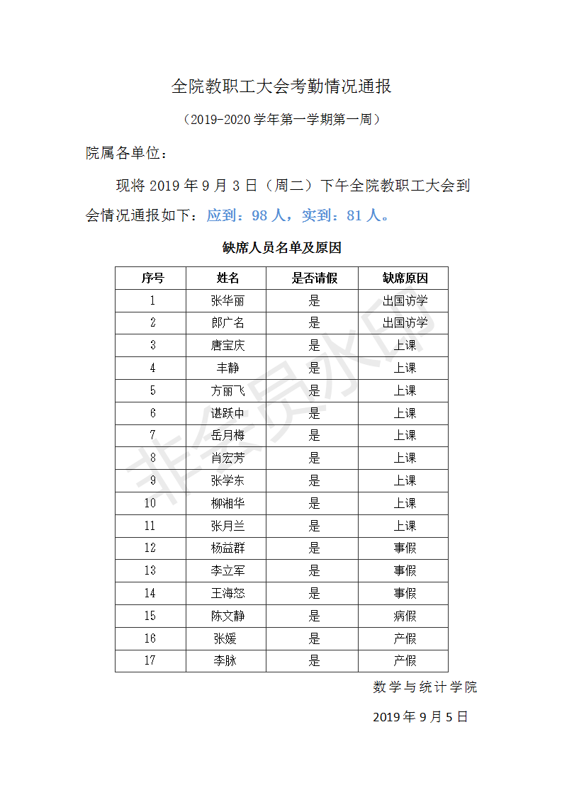 全院教职工大会考勤情况通报(2019-2020学年第一学期第一周)