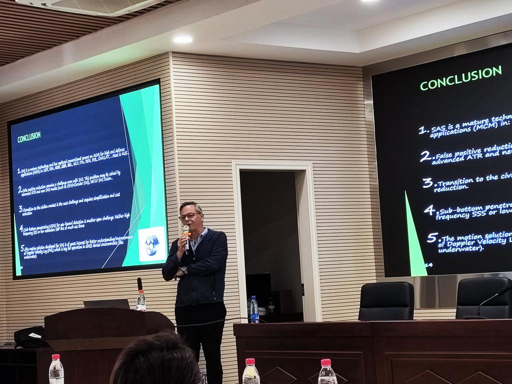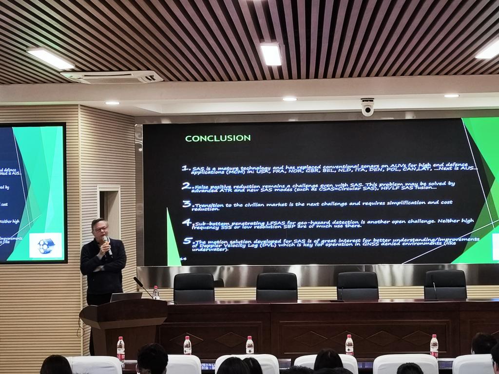 Marc A. Pinto教授首先介绍了用于高分辨率海底成像的合成孔径声纳(SAS)系统设计的关键方面。在概述SAS的预期优势和主要特征后,讨论了发射机和接收机阵列的设计,重点是用多元件接收机阵列减轻空间混叠、宽带操作和扩展到干涉式SAS以估计海底水深。接着讲述了SAS中最困难微导航问题,即以所需的亚波长精度估计不需要的平台运动。最后,他重点指出已在海上证明其价值的方法,这些方法将惯性导航系统(INS)与基于位移相位中心天线(DPCA)技术的数据驱动方法相结合。