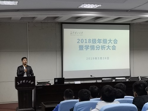 会议伊始,柳映堂对上学期18级学生的四级过级率进行了通报。他首先表扬了四级过级率较高的几个班级,接着鼓励了未过四级的同学不要放弃,努力学习英语,争取在本学期内通过四级。随后,柳映堂对上学期各班的期末考试成绩进行了总结分析。他讲到上学期年级专业课的挂科率偏高,尤其是数学和信计专业,希望在新的学期内大家能够脚踏实地,花更多的精力在学习上,学好自身的专业知识,为以后的学习及就业打好基础。