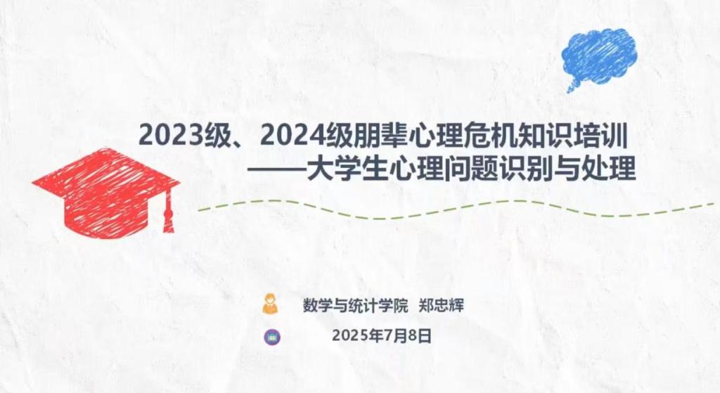 7月8日,我院以线上会议的形式举办心理朋辈培训会。院党委副书记兼副院长郑忠辉出席会议,参加会议的还有23、24级所有班委及寝室长。会议由心理部黄薛菲主持