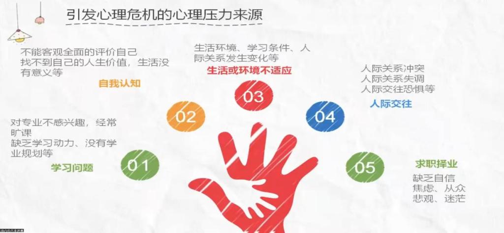 会议之中,郑忠辉在分析大学生引发心理危机的心理压力来源时首先指出是学业问题,其次是自我认知问题,第三是生活环境不适应,第四是人际交往问题,最后是求职择业问题,他建议同学们在大学期间多开展实践活动、jk黑色丝袜美女被网站活动等,以帮助更好地适应新环境,预防心理危机的发生。