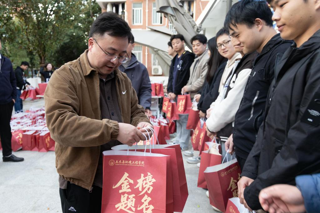 随后,与会领导和老师亲手将一份份满载心意的“考研大礼包”送到学子代表手中。礼包内的每一份物品,都承载着学院对学子们的深情关怀与美好祝愿,让在场学子们深切感受到了来自学院的温暖与力量,备受鼓舞。同学们纷纷表示,将把这份关怀转化为冲刺备考的强大动力,以时不我待的紧迫感全力以赴,以最饱满的状态迎接考试,力争交出优异答卷。