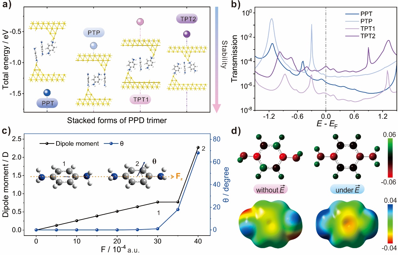 图2. 不同π-π堆叠构型下PPD三聚体分子结的总能量与电子透射谱,以及外加电场作用下偶极矩、Mulliken电荷分布与静电势分布的理论计算。